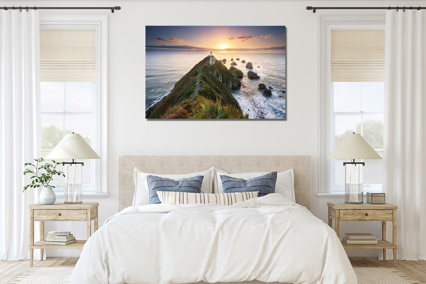 A beautiful sunrise at the iconic Nugget Point lighthouse. Located at the northern end of the Catlins coast, along the road from Kaka Point, this steep headland has a lighthouse at its tip, surrounded by rocky islets (The Nuggets).